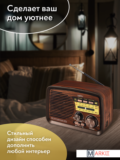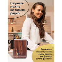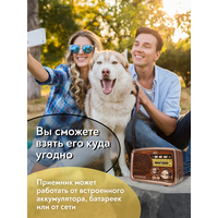 Радиоприемник MIRU SR-1027 коричневого цвета имеет ретро дизайн, простой функционал и обеспечивает приём сигналов в диапазоне FM, AM и SW. Аналоговый способ настройки частоты предполагает более точное и быстрое улавливание нужного канала. Для улучшения качества сигнала у радиоприемника имеется поворотная телескопическая антенна. Радиоприемник SR-1027 может работать как от сети 220В и аккумулятора, так и от двух батареек типа R20(D). Органы регулировки громкость и смена диапазонов расположены на передней панели приемника. Также предусмотрено проигрывание с USB и microSD накопителей. Данный радиоприемник отлично подойдет для туристов, дачников и просто любителей отдыха на природе.
