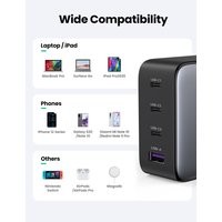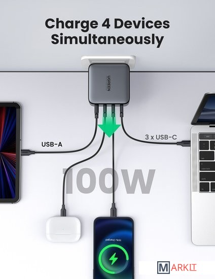Выходная мощность 100 Вт3 порта USB C и 1 порт USB A для зарядкиНовейшая технология GaN для быстрой и безопасной зарядкиUSB C Port:PD3.0(PD2.0) /QC4+(QC4.0QC3.0QC2.0)/PPS /AFC/APPLE 5V2.4A/BC1.2USB A Port:SCP/QC3.0/AFC/FCP/APPLE 5V2.4A/BC1.2